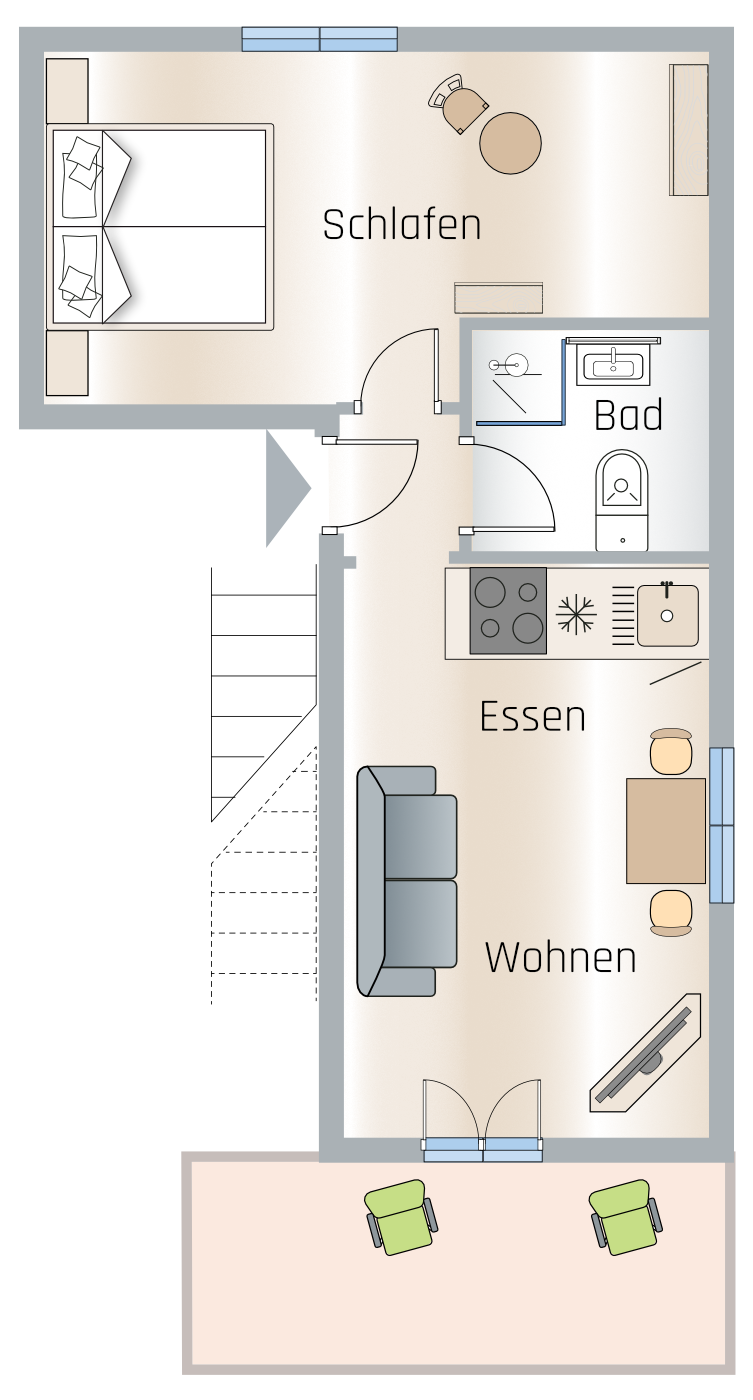 Die Wohnung ist über eine Treppe in das Obergeschoss vom Haupteingang des Hauses erreichbar. Sie verfügt über ein gemütliches Wohnzimmer mit funktionaler Kochnische mit 2 Kochplatten.