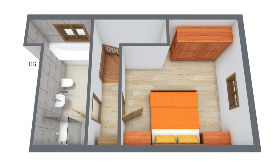 Über die Holztreppe gelangen Sie in das Obergeschoss mit dem Schlafzimmer (Bettenmaß 180 x 200cm).cm.