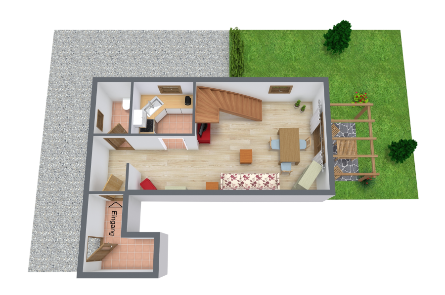 Vom Eingangsbereich mit Gäste WC kommen Sie in das offene Wohnzimmer mit Zugang über die Terasse in den großen Garten.